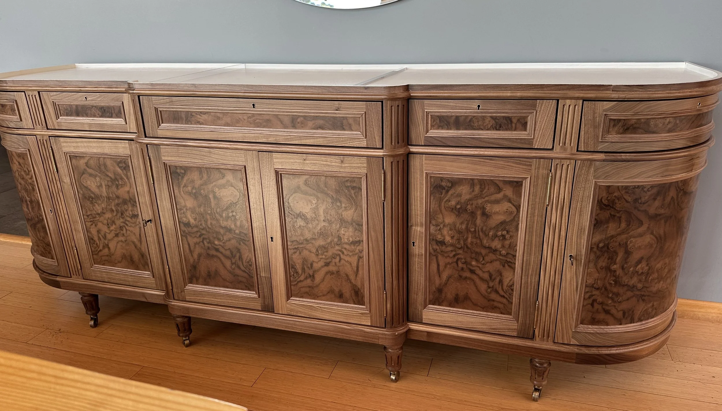 The form is a center stage piece, commanding attention. A bow-front silhouette nods to 18th-century sideboards, softened by contemporary restraint. The cabinet’s structure is solid walnut, but it’s the burl that draws you in—each panel carefully matched for balance, movement, and depth.